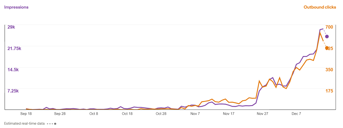 She’s been pinning for a while - We had an issue with that Pinterest account for the longest time though, and so it was probably 2 months ago that she/one of our team members started pinning a bit more agressively. That and a lot of blog posts she wrote are Christmas/Winter themed, so that’s also helping with the quick increase. But I’d say probably around 2-3 months.