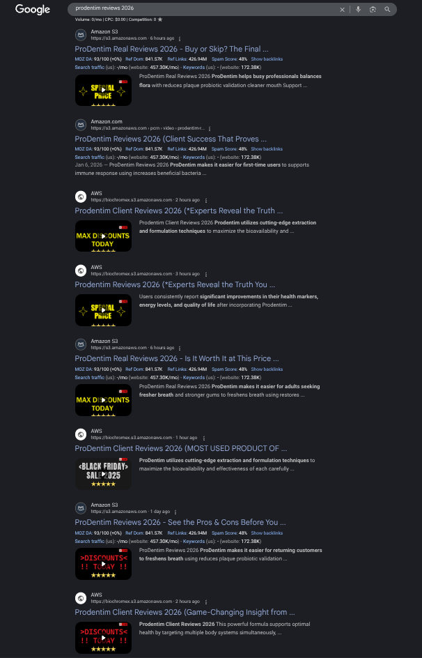 ProDentim is a highly competitive Clickbank product and the SERP is very difficult to break into. These mass parasite operations are coining it !!