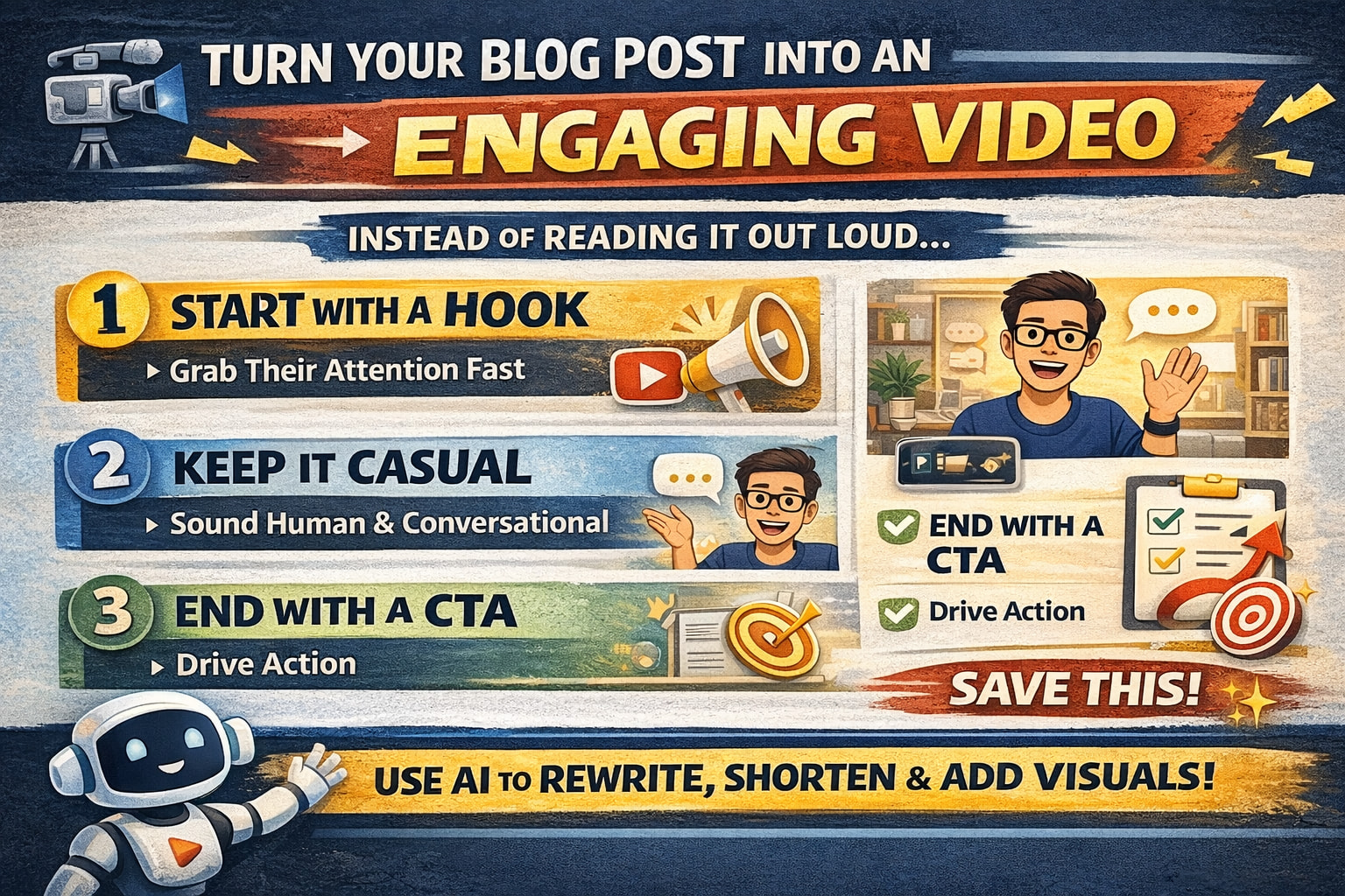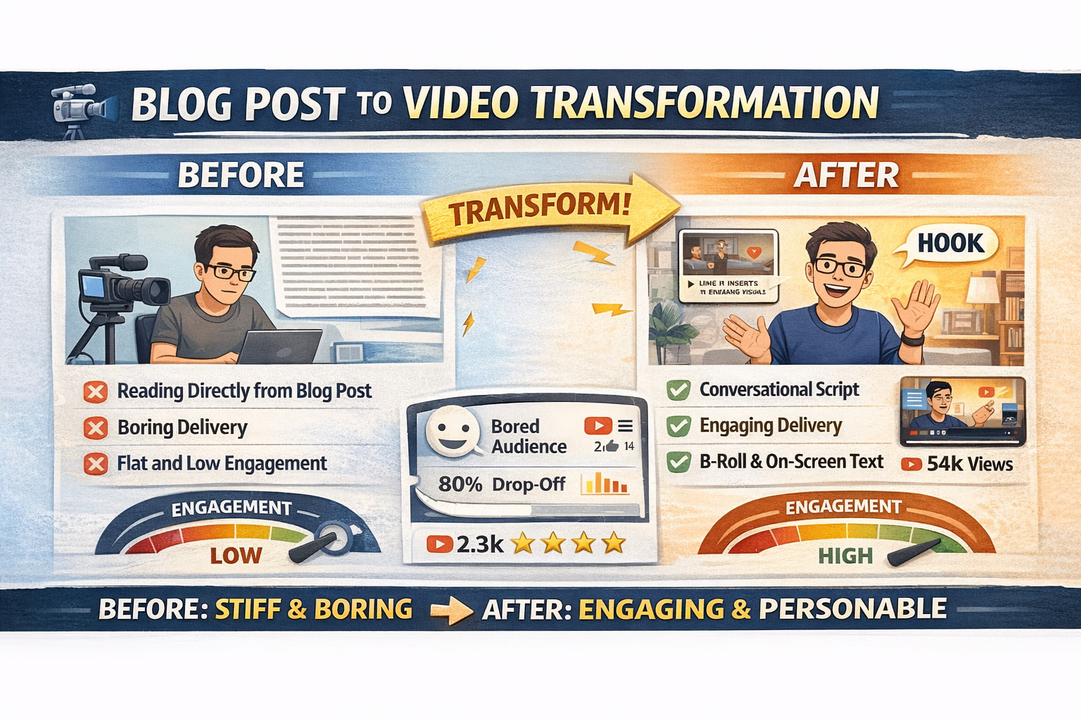 Blogs are written to be skimmed. Videos are spoken. They need shorter sentences, cleaner transitions, and a hook that hits fast.